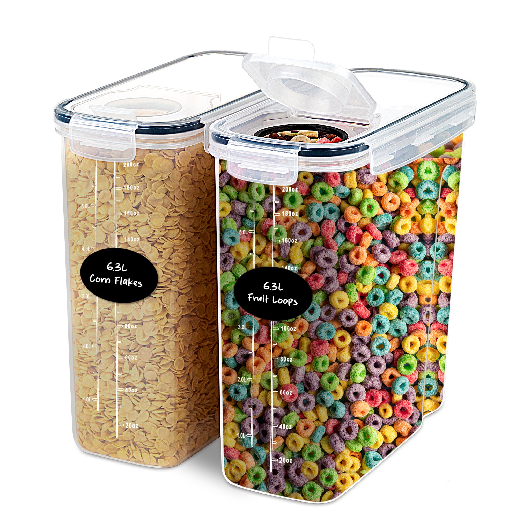 Organize with Ease: We include 8 reusable labels and a marker – simply peel, write, and stick for instant, customizable organization. The see-through design lets you identify contents at a glance, making them perfect cereal storage containers for any pantry.